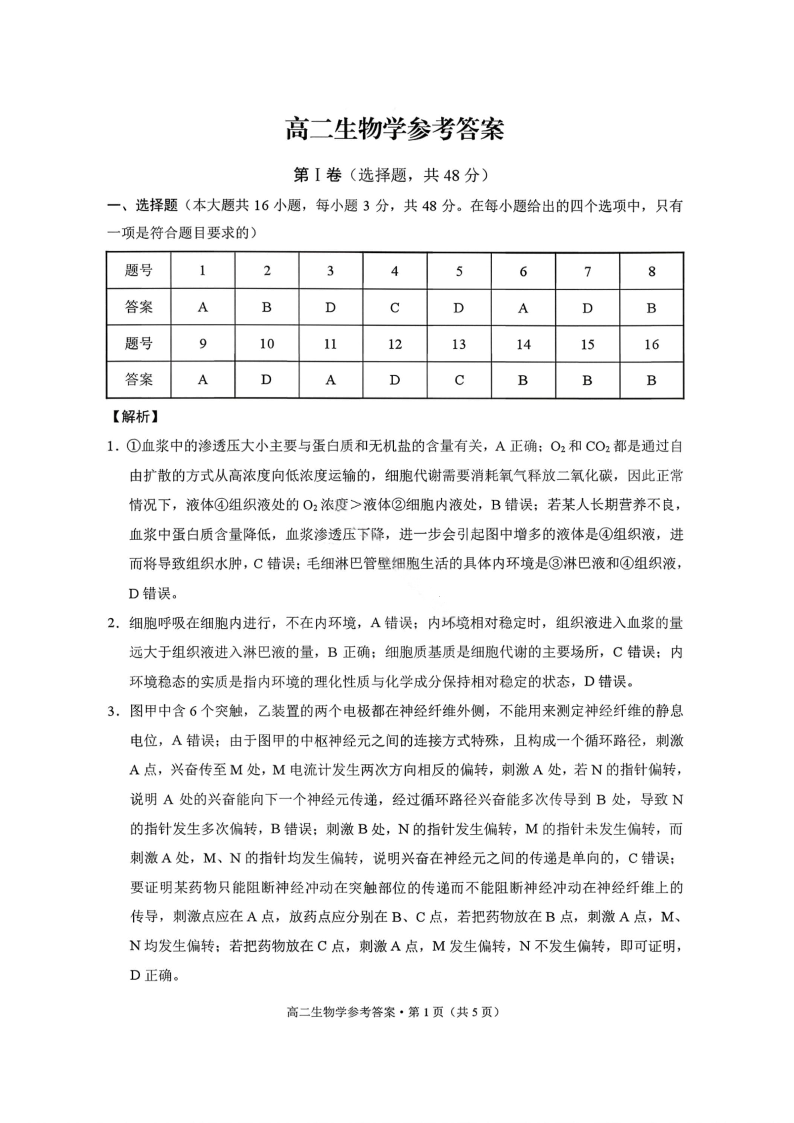 高二生物答案--贵州省贵阳市第一中学2025-2026学年高二上学期12月月考