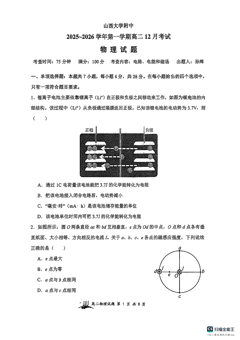 高二物理--山西省太原市山西大学附属中学校2025-2026学年高二上学期12月月考