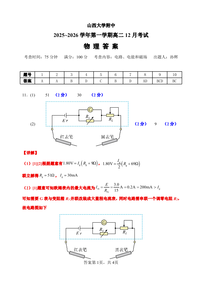 高二物理答案--山西省太原市山西大学附属中学校2025-2026学年高二上学期12月月考