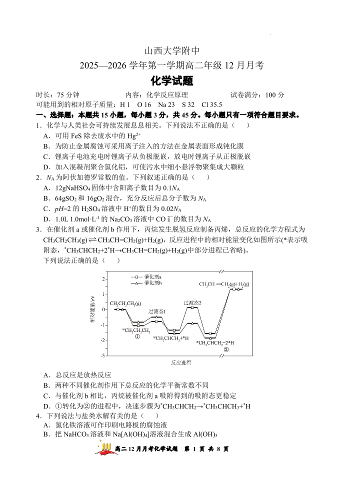 高二化学--山西省太原市山西大学附属中学校2025-2026学年高二上学期12月月考