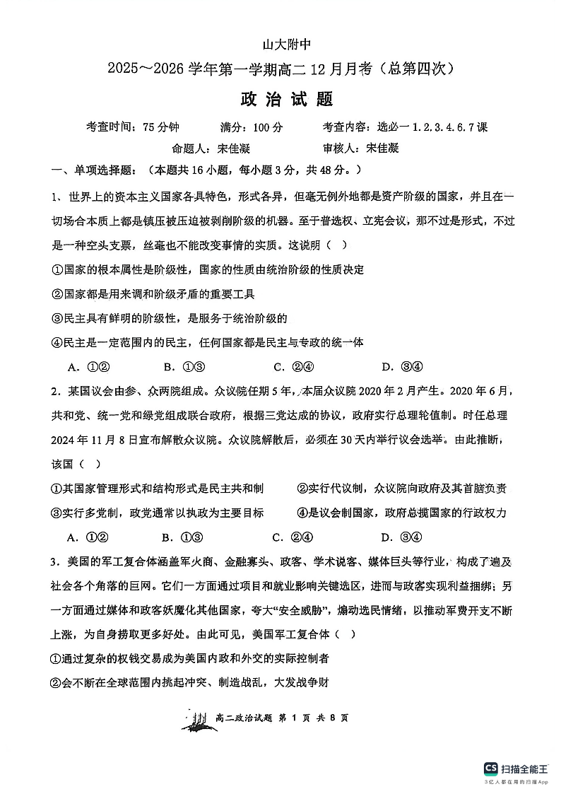 高二政治--山西省太原市山西大学附属中学校2025-2026学年高二上学期12月月考