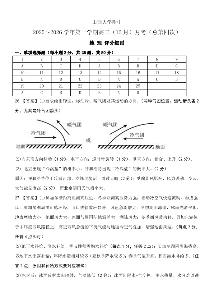高二地理答案--山西省太原市山西大学附属中学校2025-2026学年高二上学期12月月考