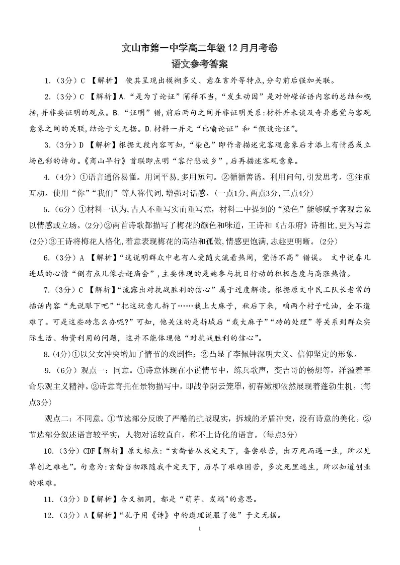 高二语文答案--云南省文山壮族苗族自治州文山市第一中学2025-2026学年高二上学期12月月考