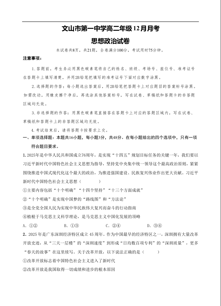高二政治--云南省文山壮族苗族自治州文山市第一中学2025-2026学年高二上学期12月月考