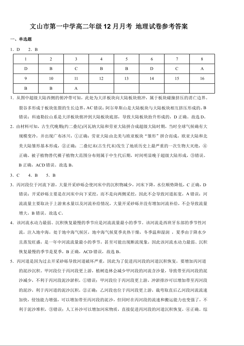 高二地理答案--云南省文山壮族苗族自治州文山市第一中学2025-2026学年高二上学期12月月考
