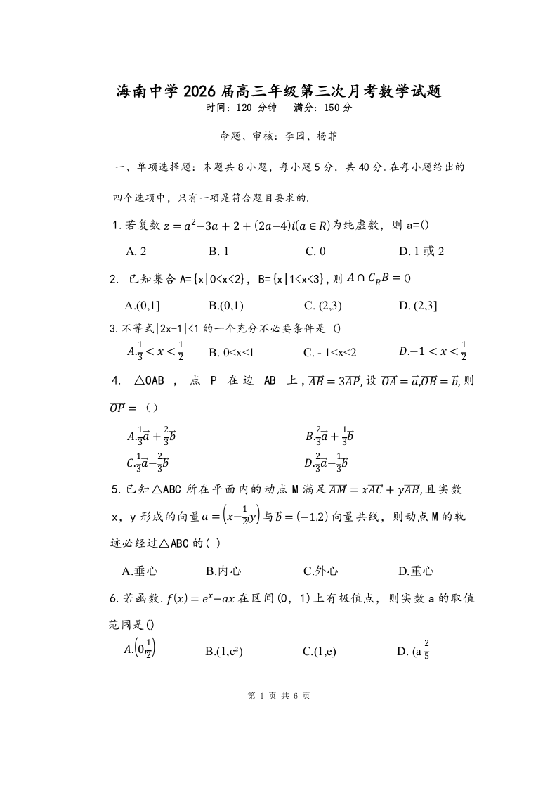 高三数学(原卷版)--海南省海口市海南中学2026届高三上学期12月月考