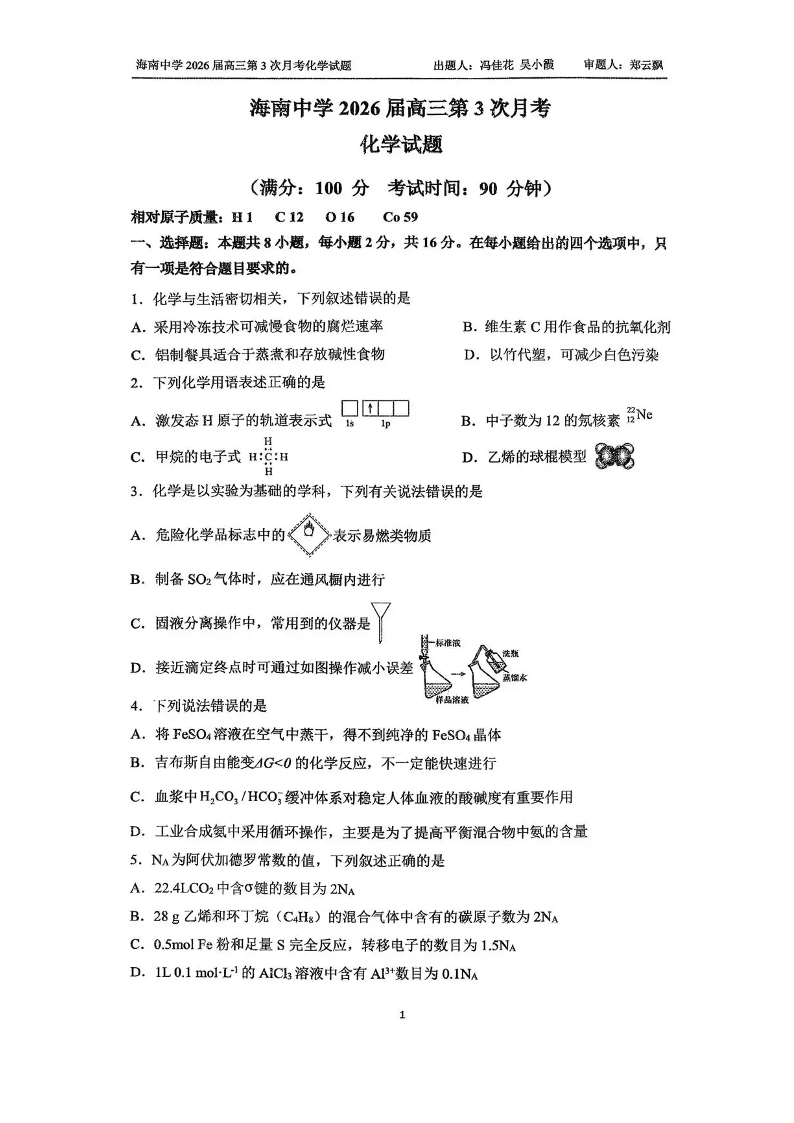 高三化学+答案--海南省海口市海南中学2026届高三上学期12月月考