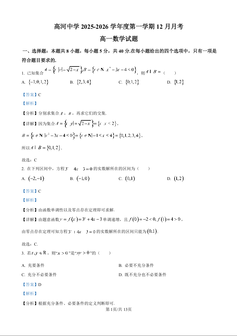 高一数学(精品解析版)--安徽省怀宁县高河中学2025-2026学年高一上学期12月月考