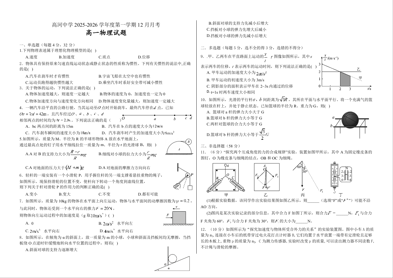 高一物理+答案--安徽省怀宁县高河中学2025-2026学年高一上学期12月月考