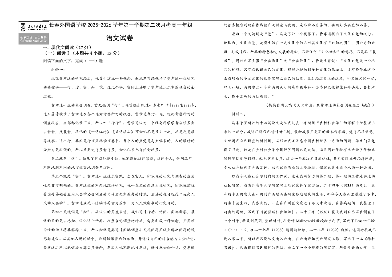 高一语文+答案--吉林省长春外国语学校2025-2026学年高一上学期12月月考