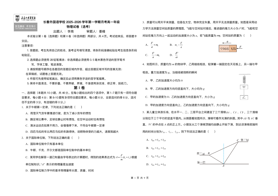 高一物理+答案--吉林省长春外国语学校2025-2026学年高一上学期12月月考