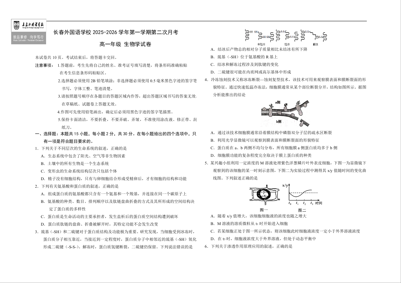 高一生物+答案--吉林省长春外国语学校2025-2026学年高一上学期12月月考