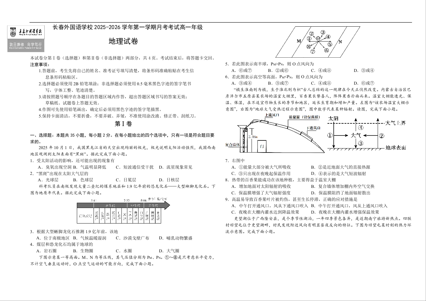 高一地理+答案--吉林省长春外国语学校2025-2026学年高一上学期12月月考