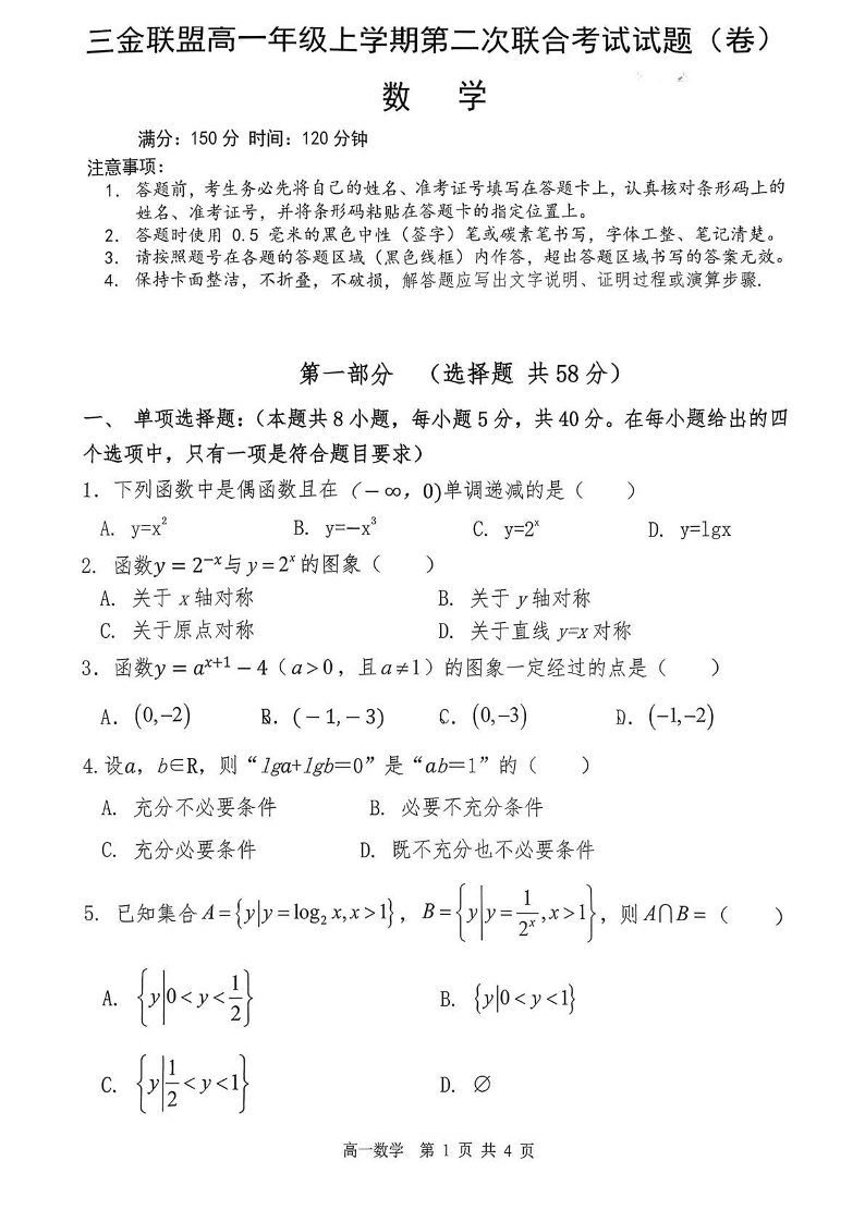 高一数学+答案--山西省吕梁市三金联盟2025-2026学年高一上学期第二次联合考试(12月)