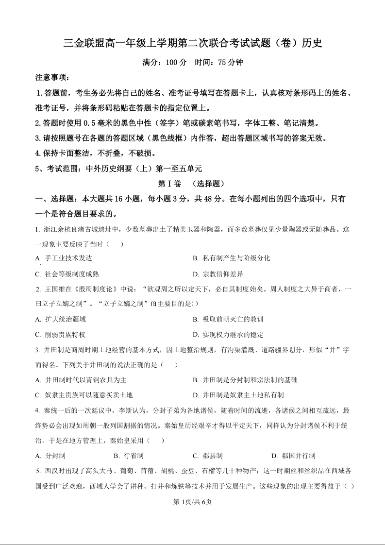 高一历史(原卷版)--山西省吕梁市三金联盟2025-2026学年高一上学期第二次联合考试(12月)