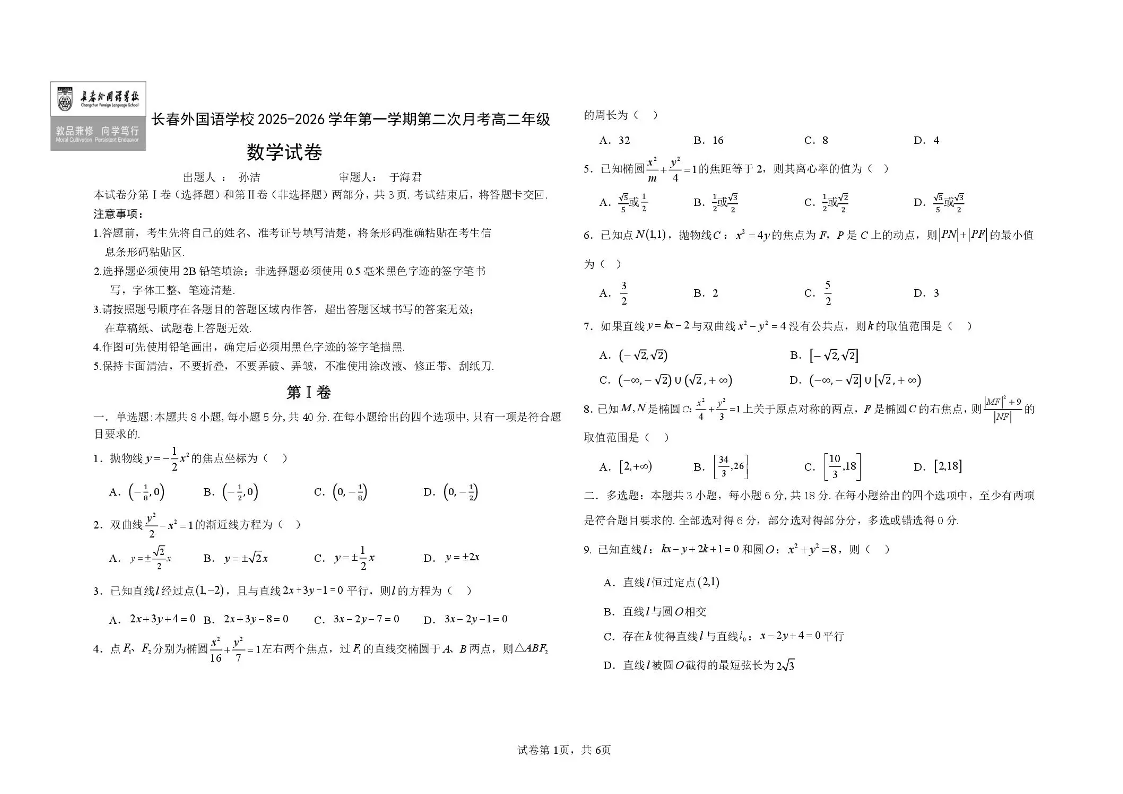高二数学+答案--吉林省长春外国语学校2025-2026学年高二上学期12月月考