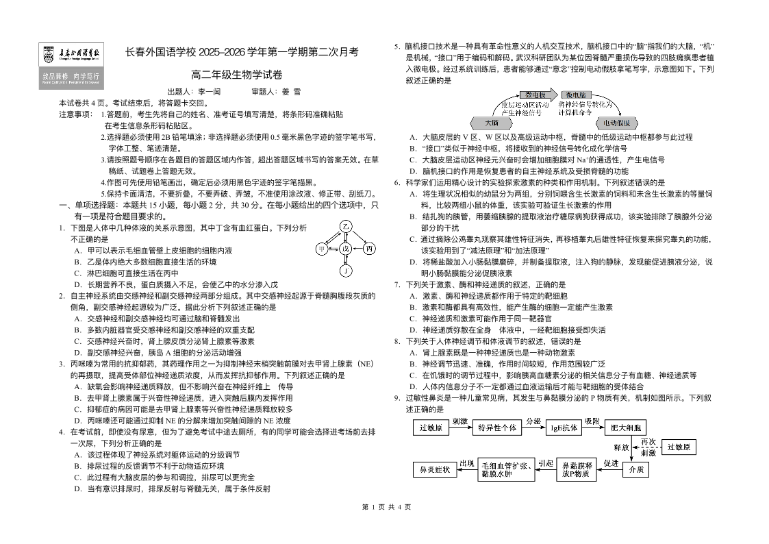 高二生物+答案--吉林省长春外国语学校2025-2026学年高二上学期12月月考