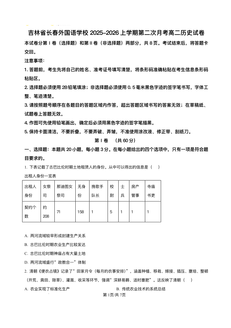 高二历史+答案--吉林省长春外国语学校2025-2026学年高二上学期12月月考