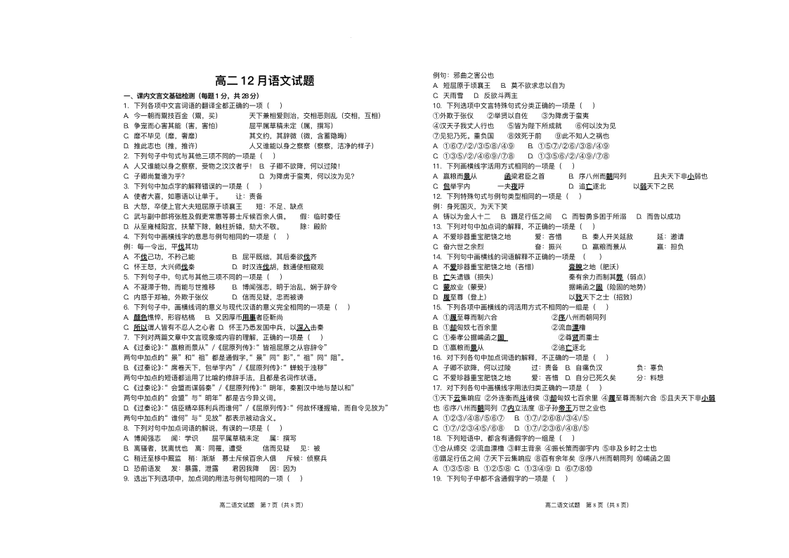 高二语文+答案--山东省菏泽第一中学(八一路校区)2025-2026学年高二上学期12月测试