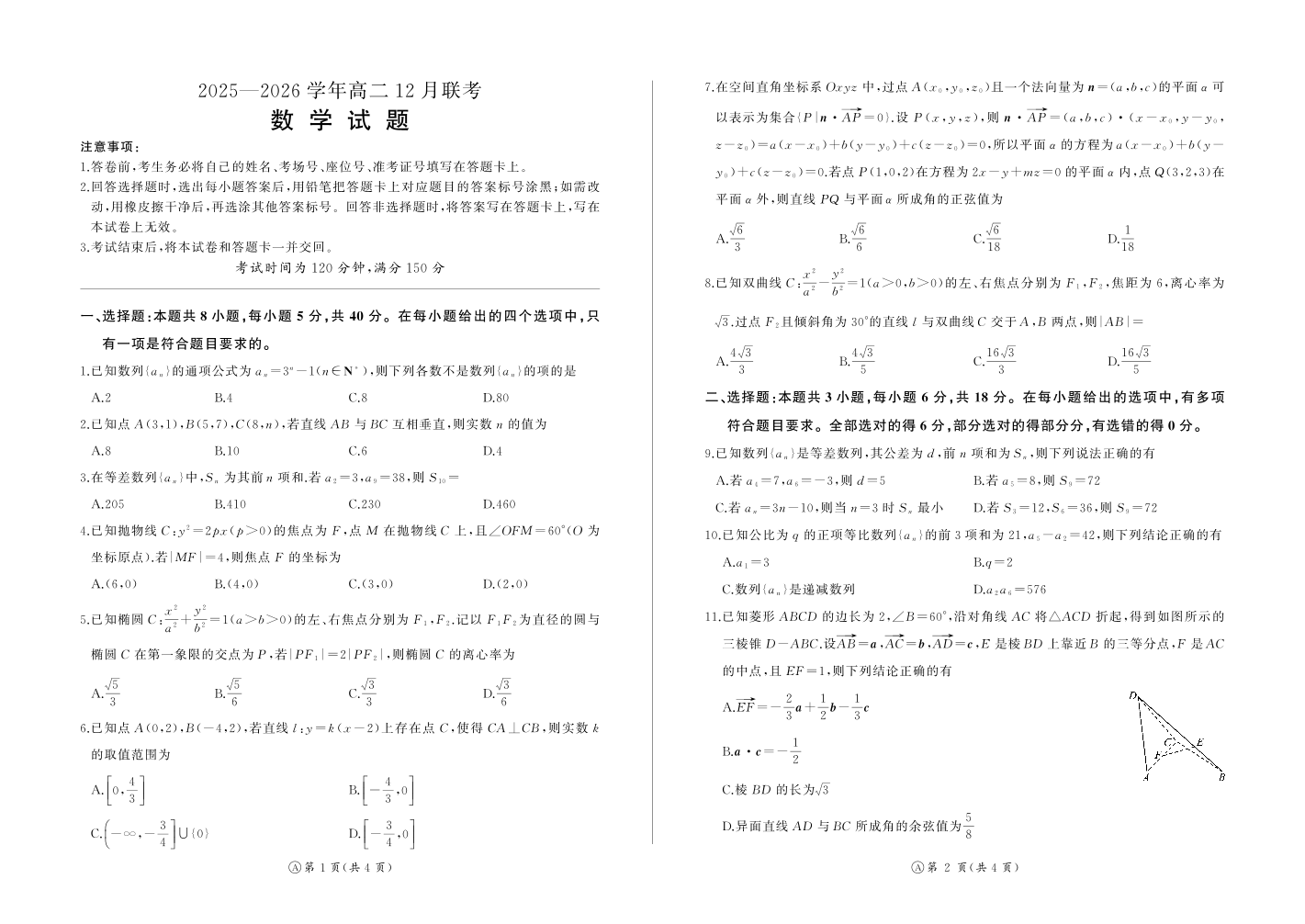 高二数学A--河南省百师联盟2025-2026学年高二上学期12月联考