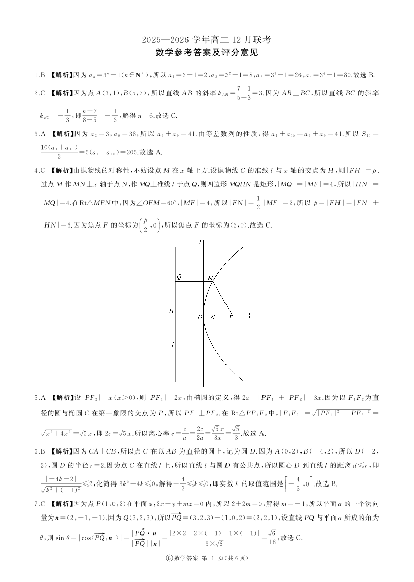 高二数学B答案--河南省百师联盟2025-2026学年高二上学期12月联考