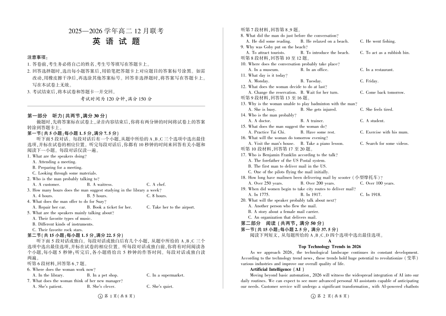 高二英语A--河南省百师联盟2025-2026学年高二上学期12月联考
