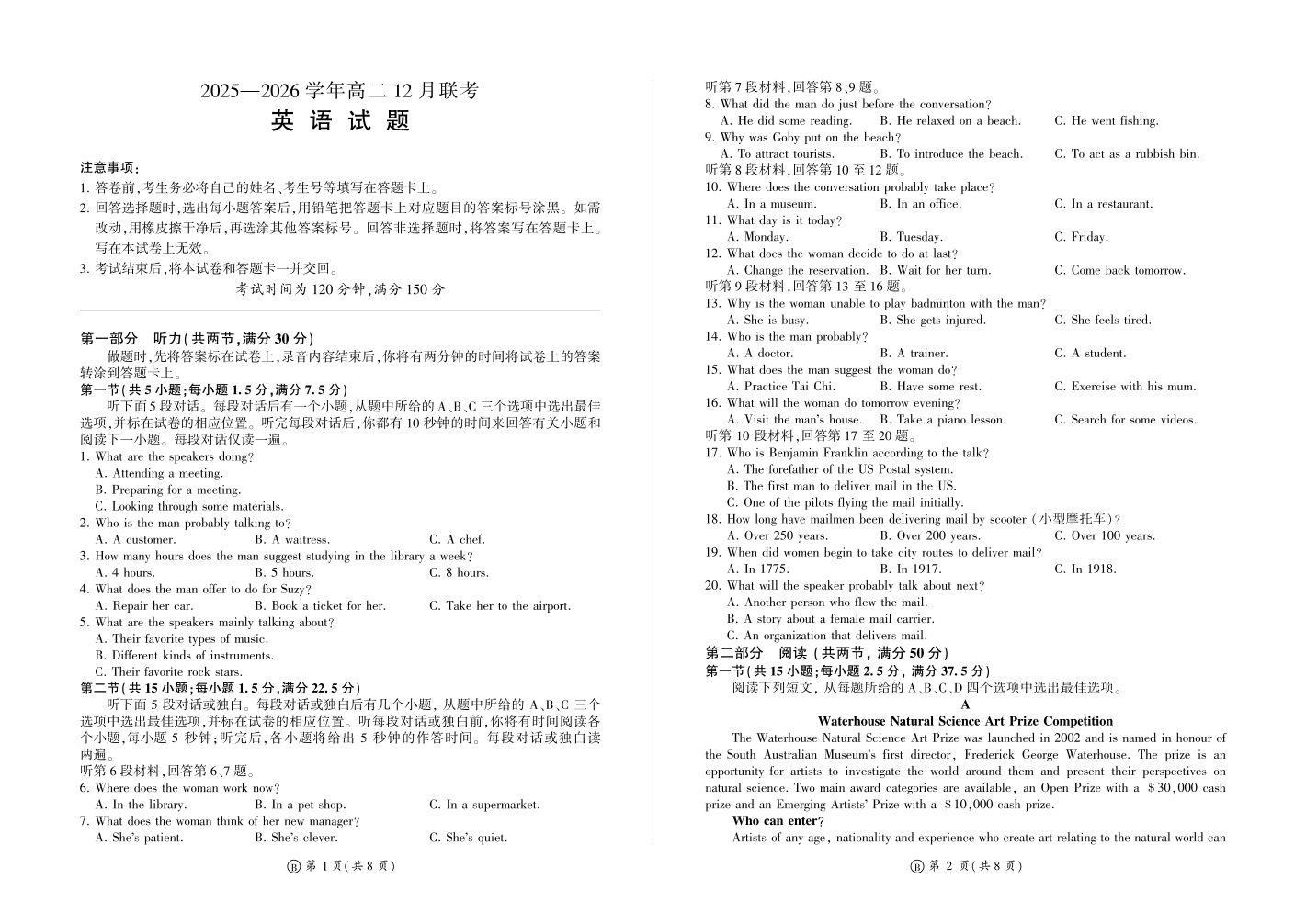 高二英语B--河南省百师联盟2025-2026学年高二上学期12月联考
