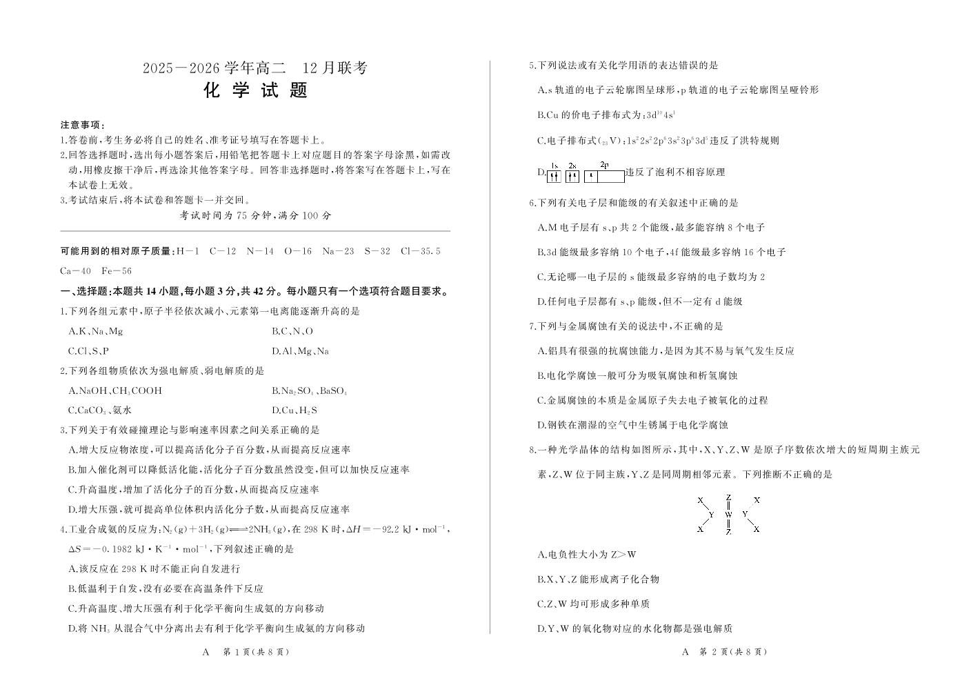 高二化学A--河南省百师联盟2025-2026学年高二上学期12月联考