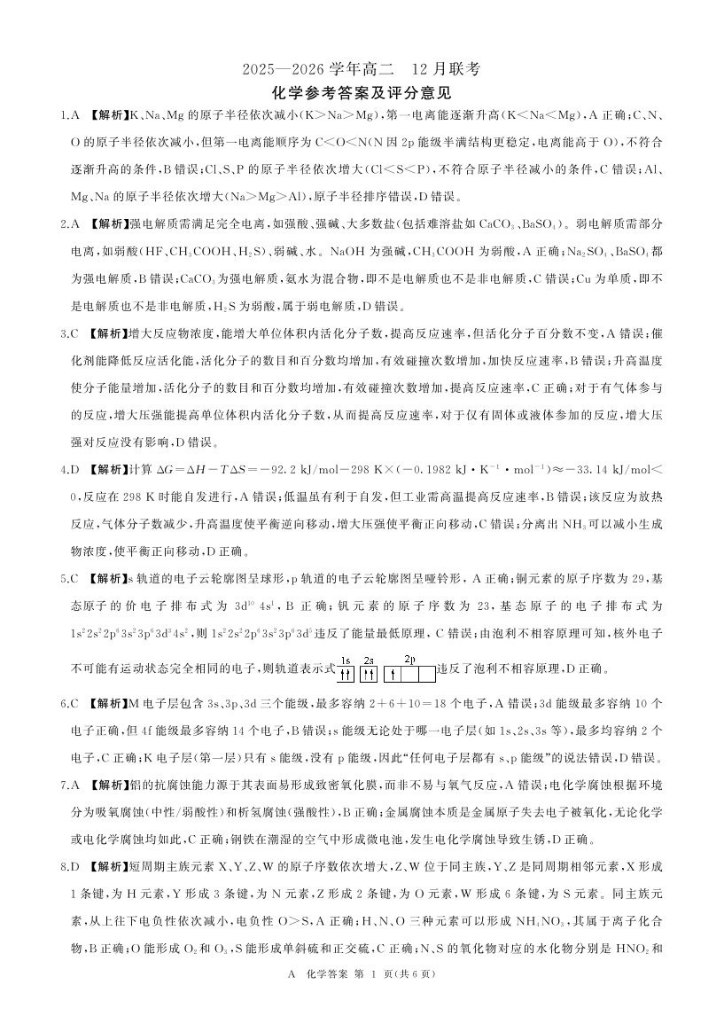 高二化学A答案--河南省百师联盟2025-2026学年高二上学期12月联考