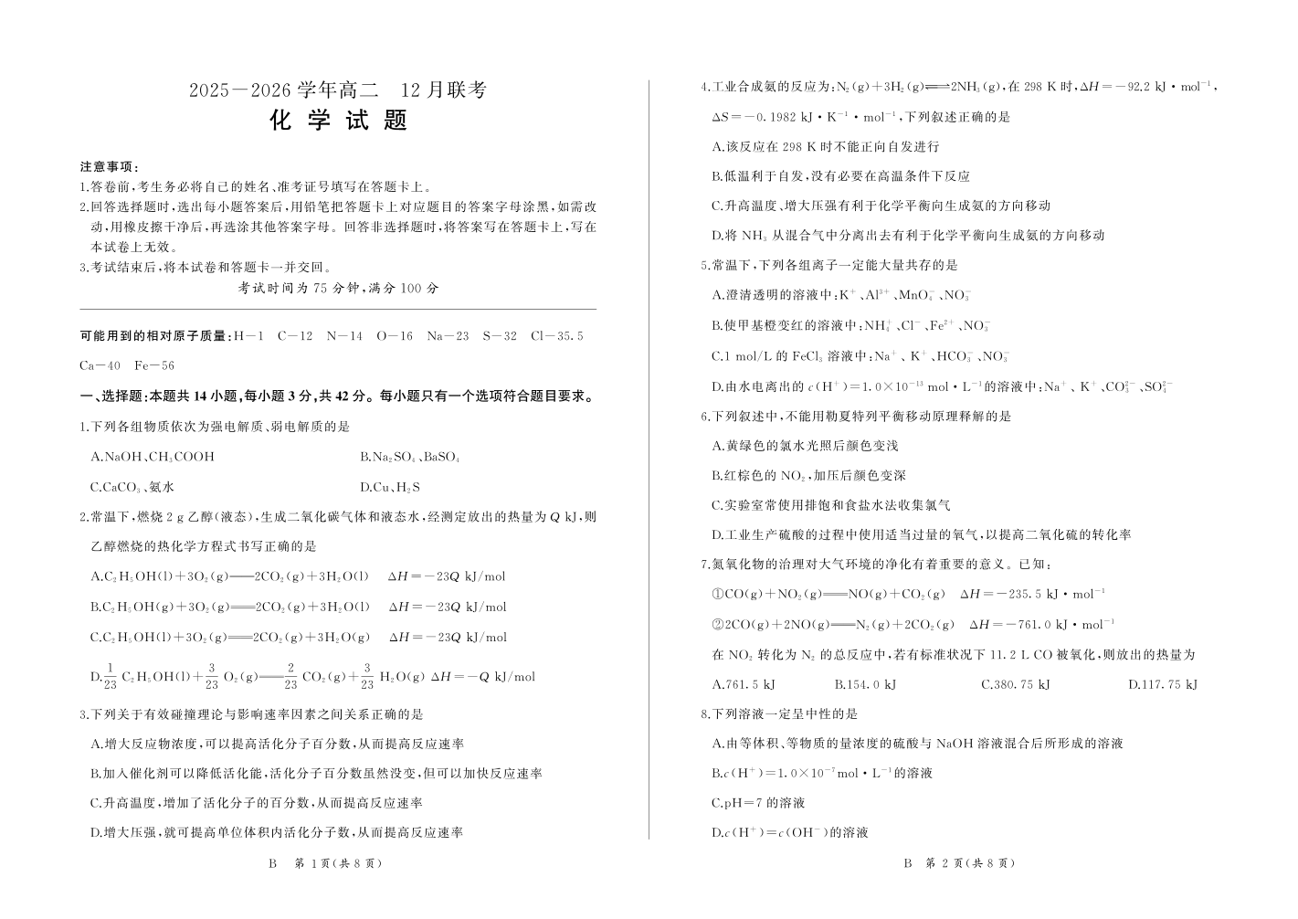 高二化学B--河南省百师联盟2025-2026学年高二上学期12月联考