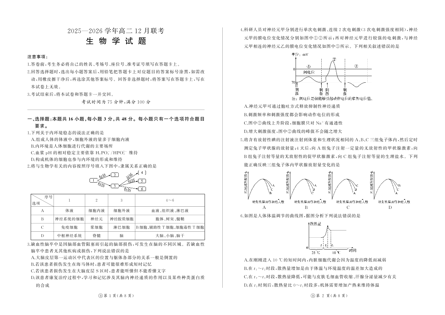 高二生物B--河南省百师联盟2025-2026学年高二上学期12月联考