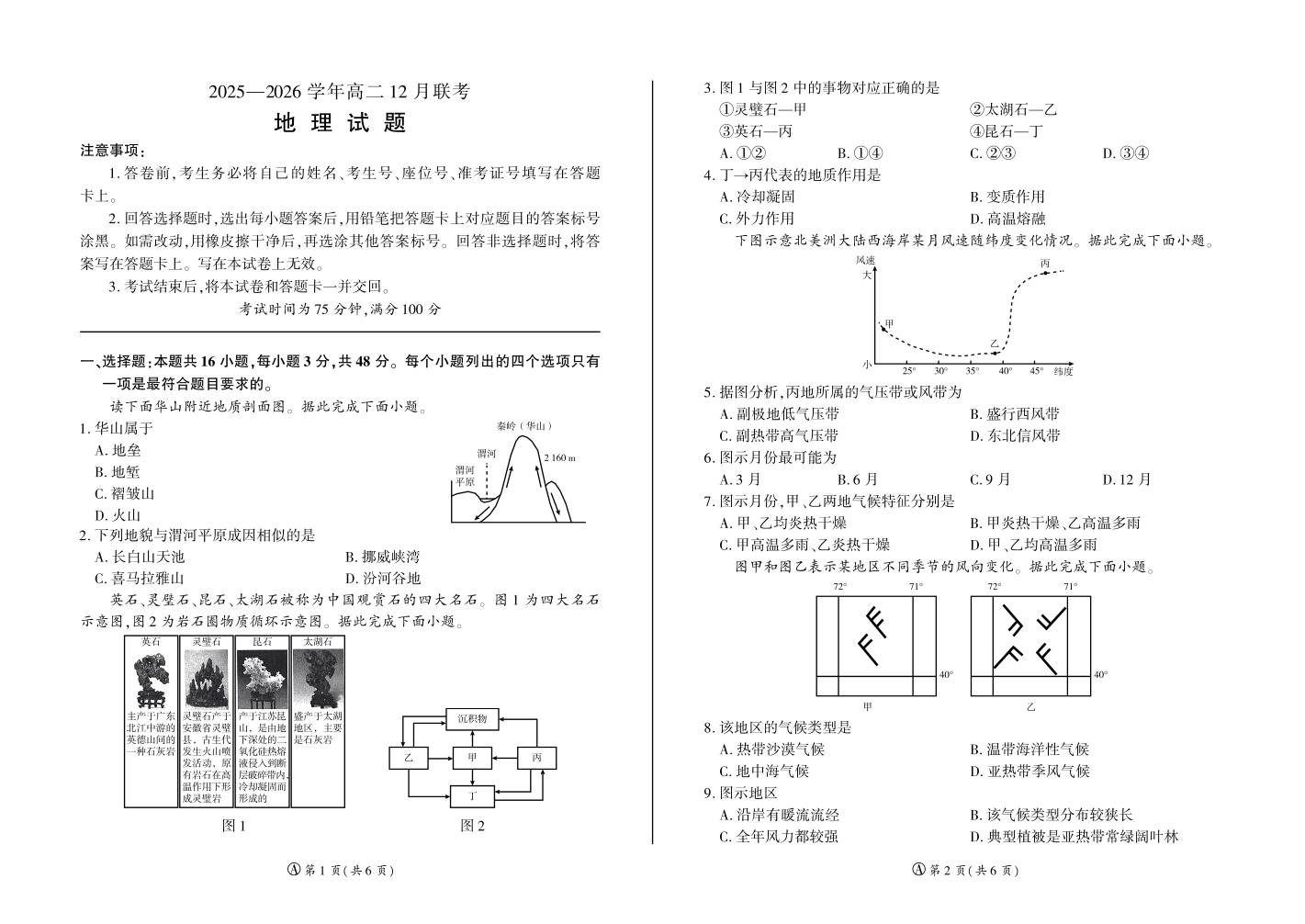 高二地理A--河南省百师联盟2025-2026学年高二上学期12月联考