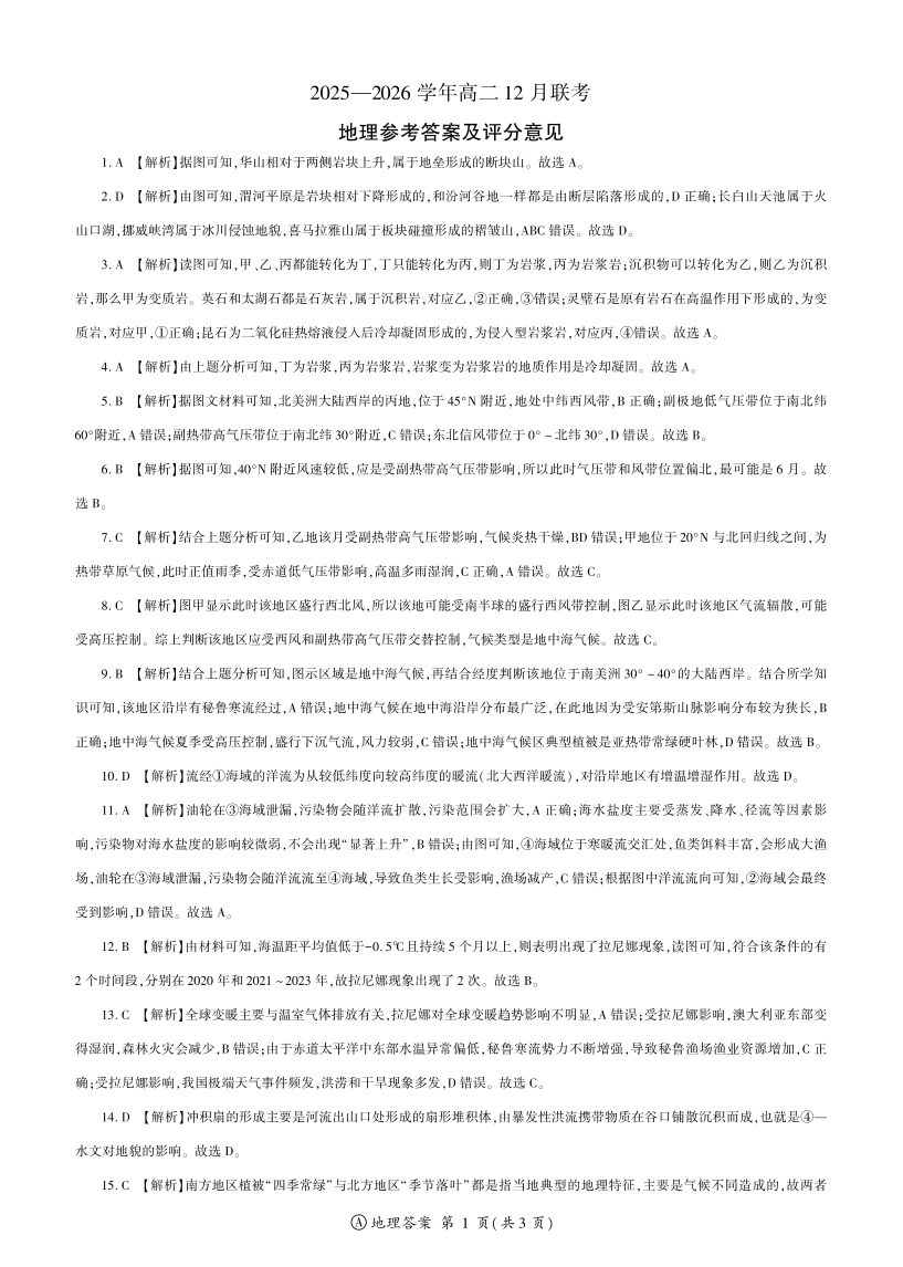 高二地理A答案--河南省百师联盟2025-2026学年高二上学期12月联考