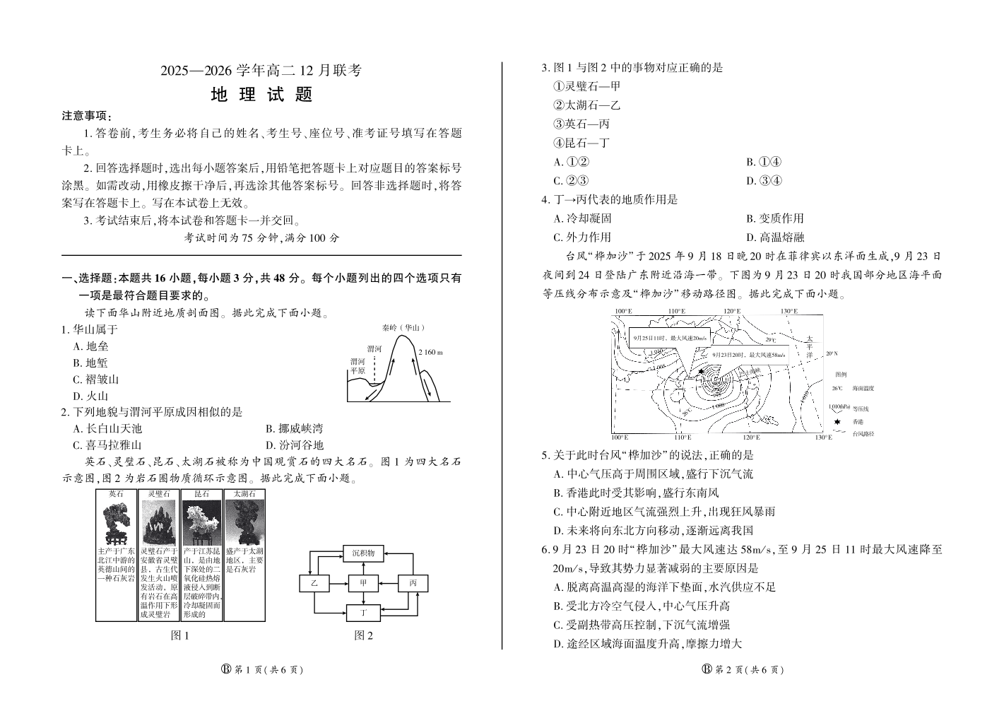 高二地理B--河南省百师联盟2025-2026学年高二上学期12月联考