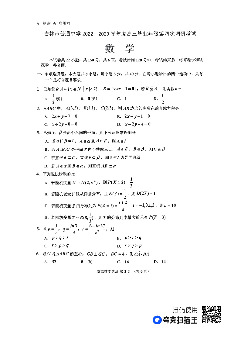 高三数学--吉林市普通高中2022-2023学年度高三年级第四次调研测试