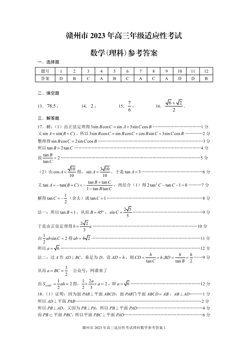 高三理数答案--江西省赣州市2025届高三第二次模拟考试