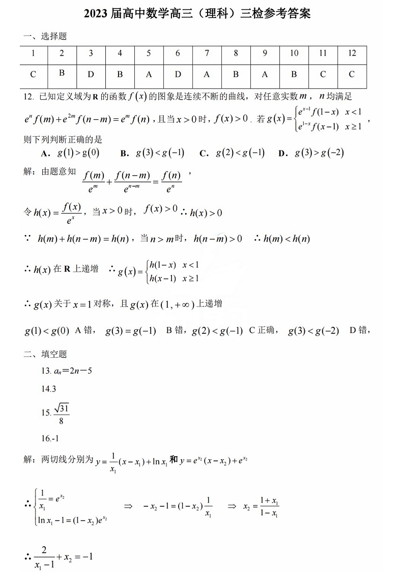 高三理数答案--江西省景德镇市2023届高三第三次质量检测卷(景德镇三模)