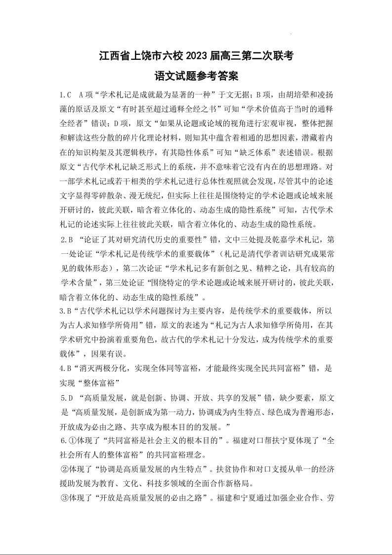 高三语文答案--江西省上饶市六校2023届高三第二次联考