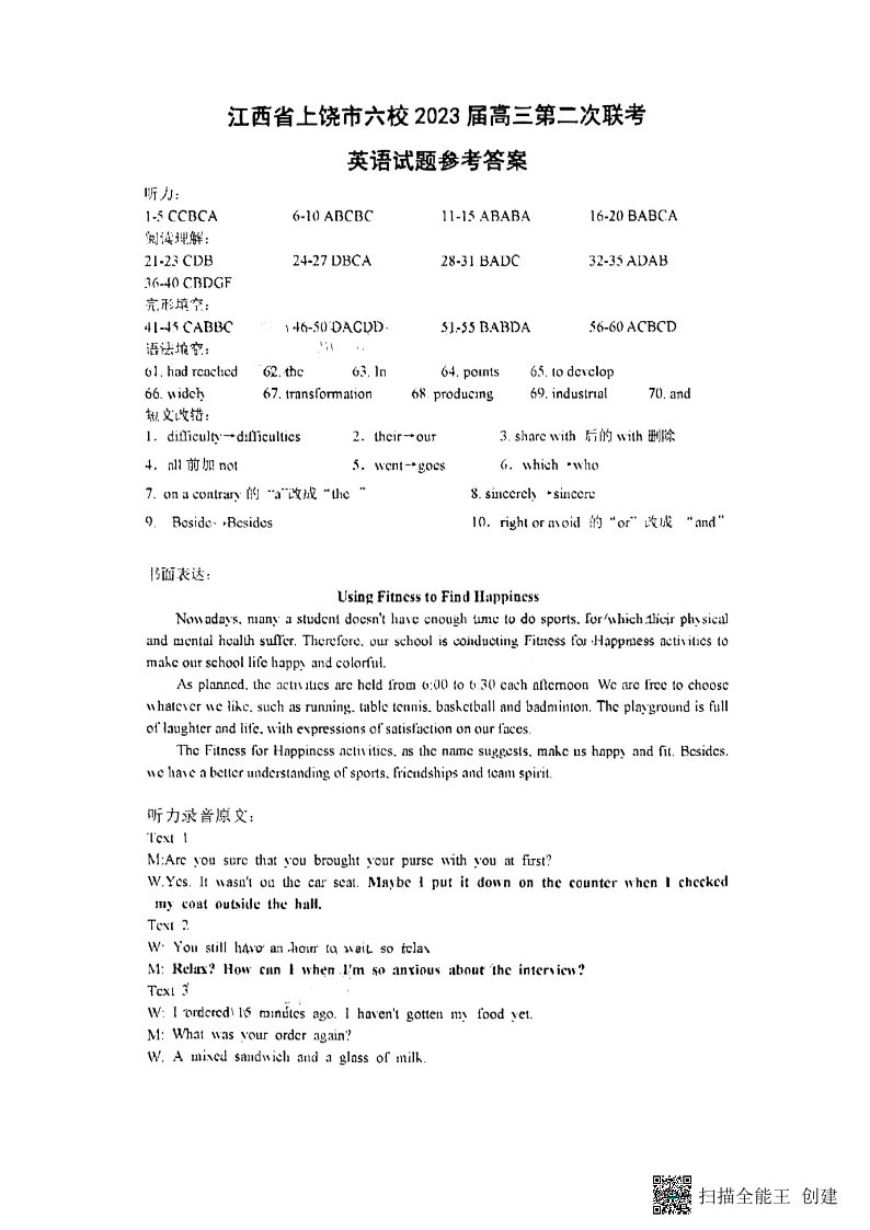 高三理综答案--江西省上饶市六校2023届高三第二次联考