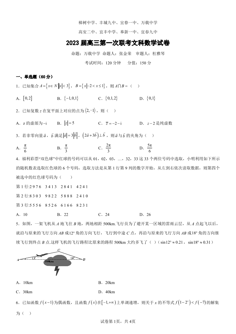 高三文数--江西省宜春市八校2023届高三第二次联考
