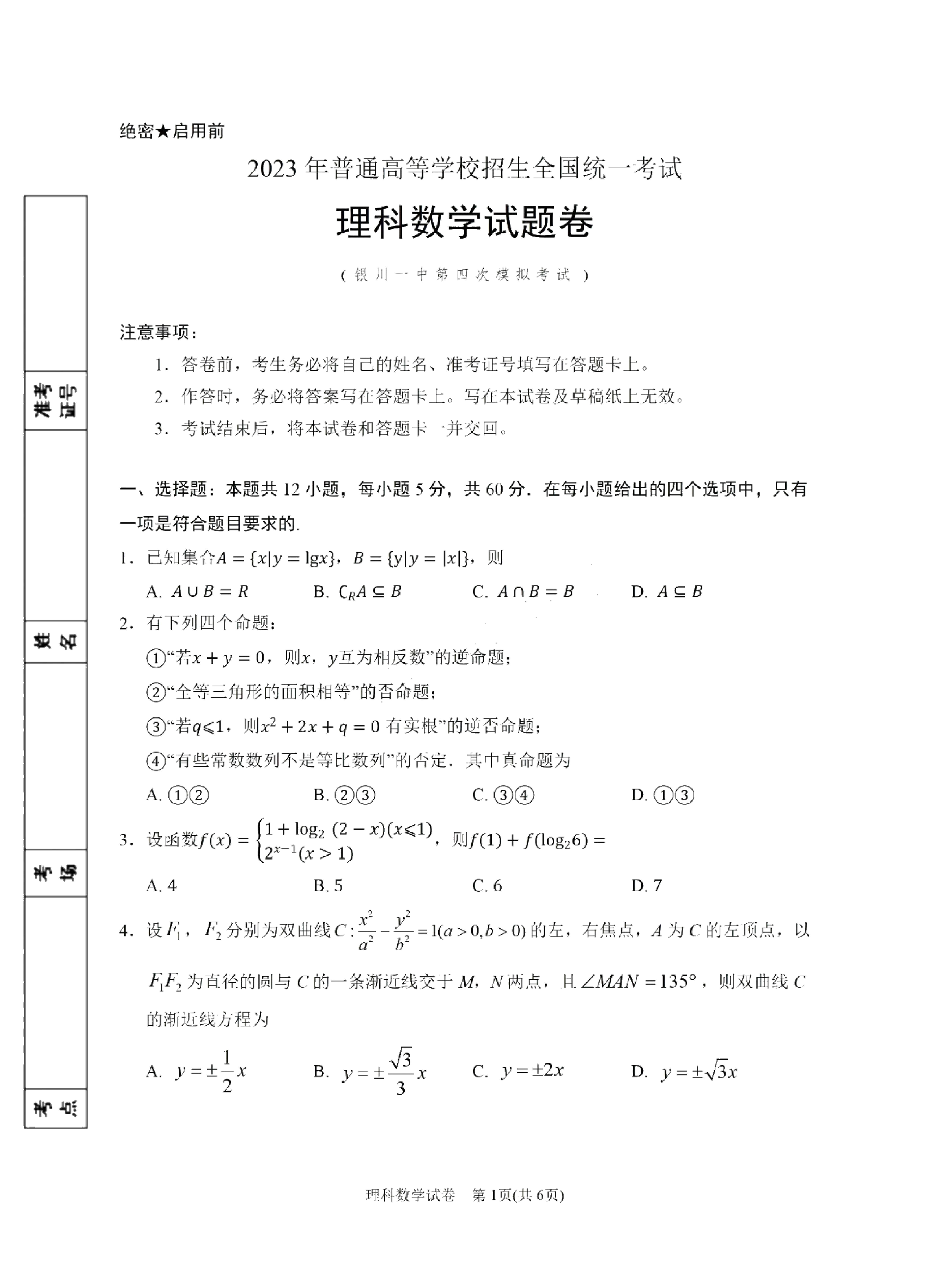 高三理数+答案--宁夏回族自治区银川一中2023届高三第四次模拟考试