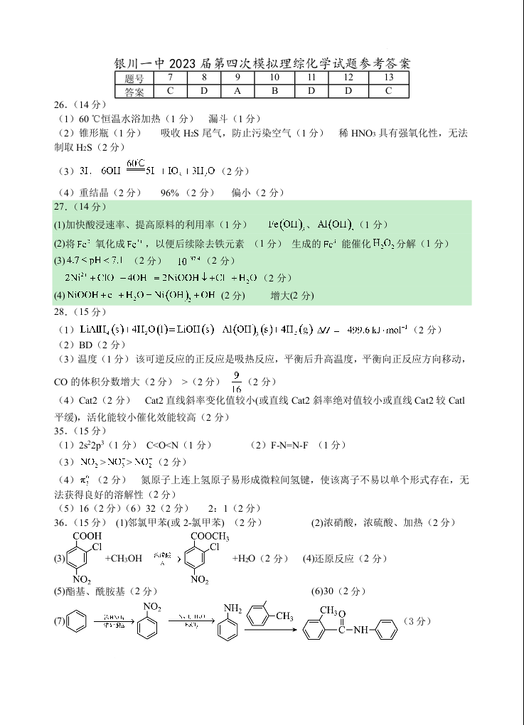 高三化学答案--宁夏回族自治区银川一中2023届高三第四次模拟考试