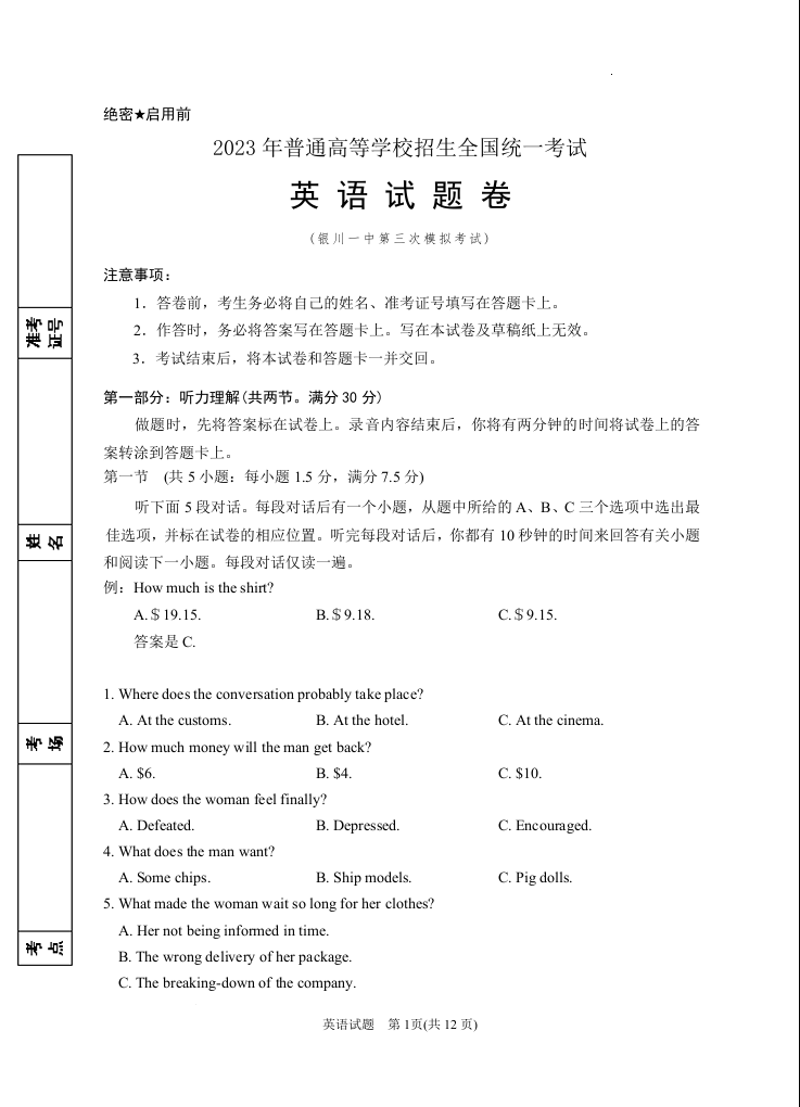 高三英语--宁夏回族自治区银川一中2023届高三下学期第三次模拟