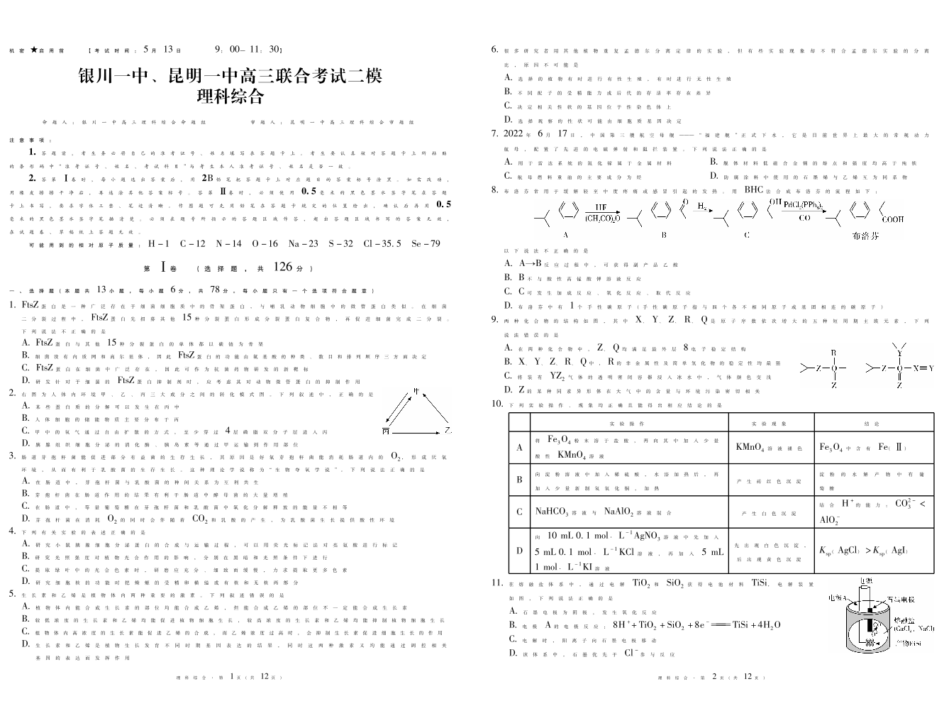 高三理综--宁夏银川一中、昆明一中2023届高三联合二模考试