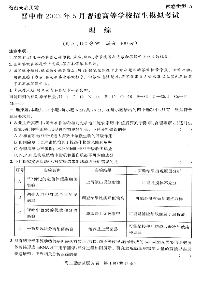 高三理综--山西晋中市2023年5月普通高等学校招生模拟考试