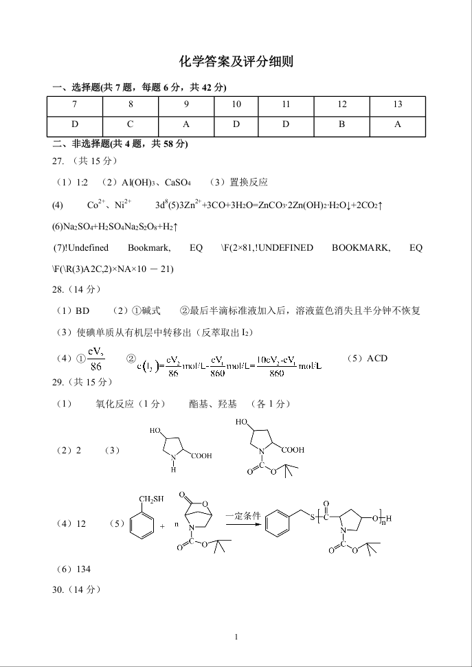 高三化学答案--山西省太原市山西大学附属中学校2023届高三下学期5月月考