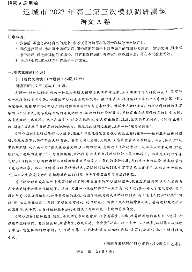 高三语文--山西省运城市2023届高三第三次模拟调研测试