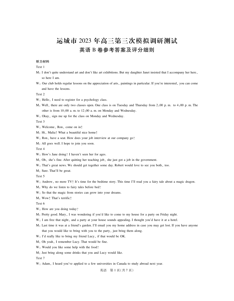 高三英语答案--山西省运城市2023届高三第三次模拟调研测试
