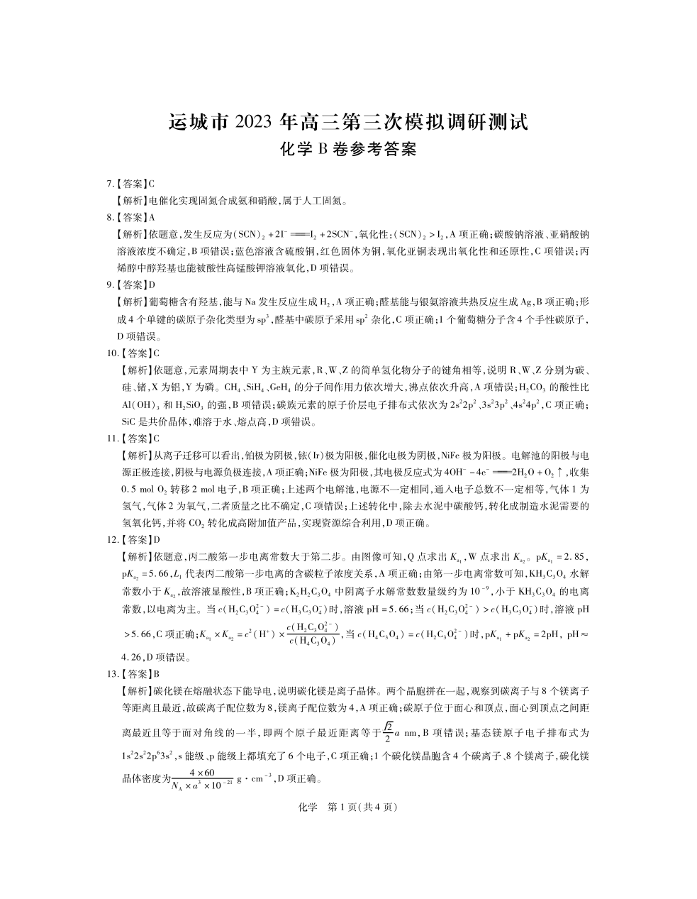 高三化学答案--山西省运城市2023届高三第三次模拟调研测试