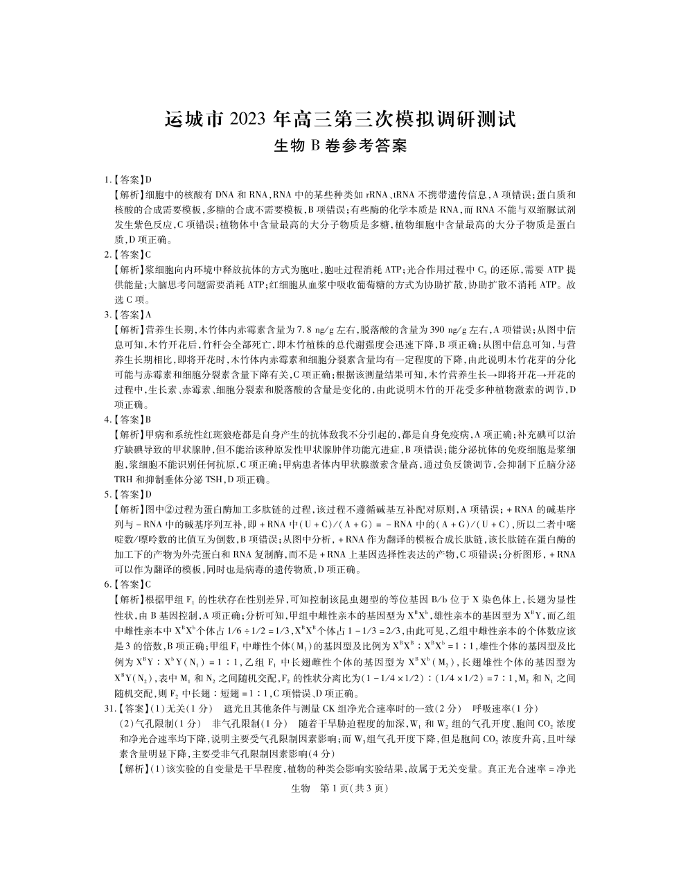高三生物答案--山西省运城市2023届高三第三次模拟调研测试